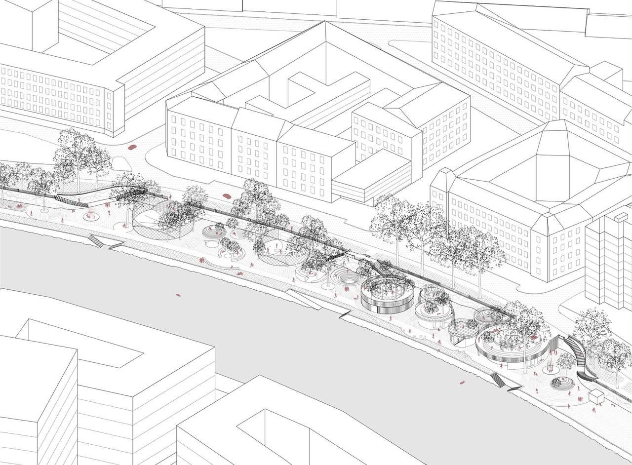 In order to create different design agendas towards trauma-informed design, various disciplines, such as artistic embodiment, multi-sensory experience, innovative psychological treatment methods, and neuroscientific knowledge generate different design responses. Those exemplary responses are incorporated on a design task of a therapy quarter at a site by the Donaukanal in Vienna, Austria. Ultimately, mental health and the public life intersect on such an urban spot. This gives the project an opportunity to explore the interrelations between the informal trauma-informed design of public spaces and the specific configuration of novel embodied psychotherapy typologies.