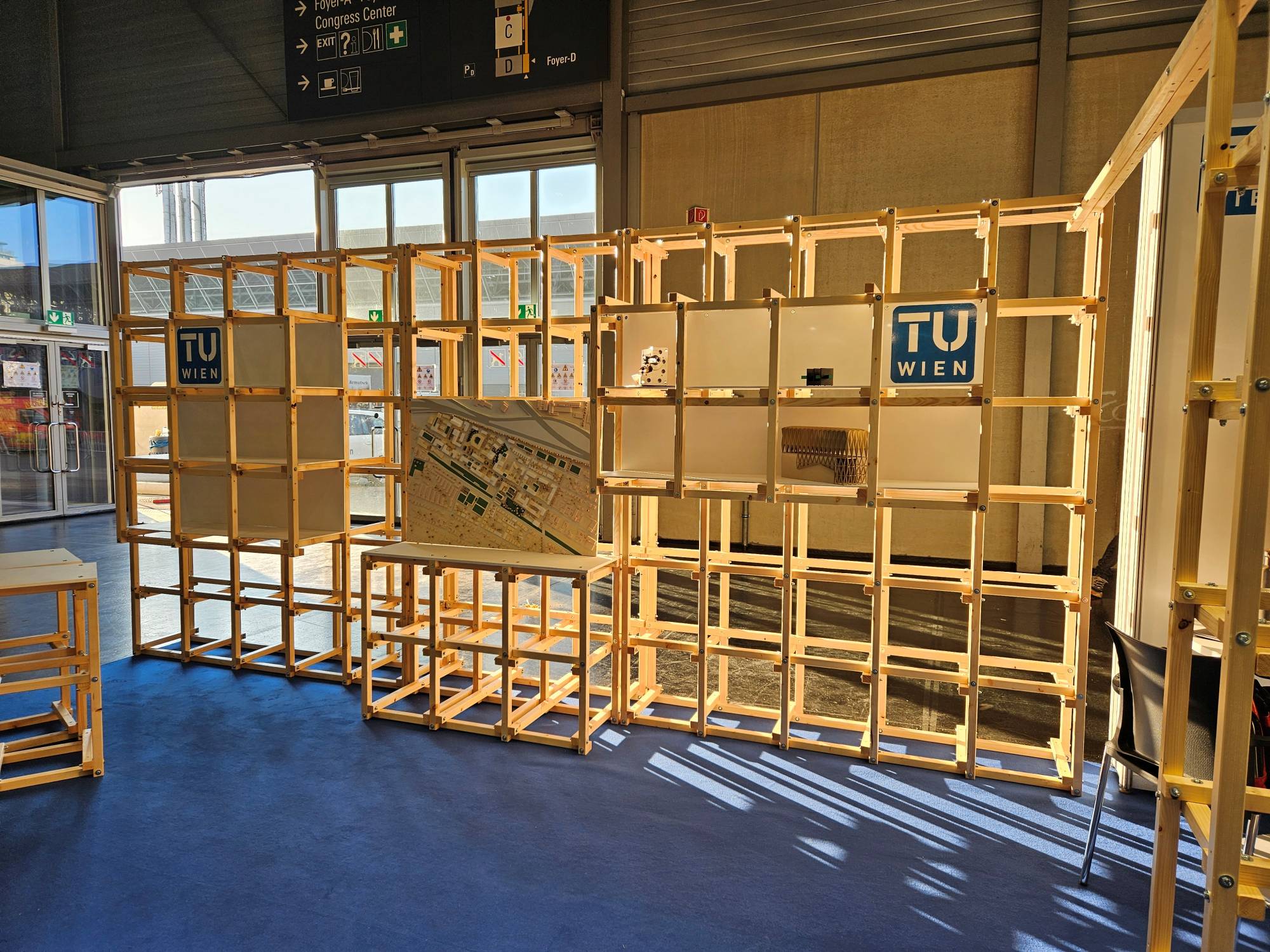 So entstand ein Messebaukonzept auf der Ausstellungsfläche, dem auch didaktische Überlegungen zugrunde liegen. Entworfen, geplant und realisiert wurde der Stand von vier Architekturstudierenden der TU-Wien im Wintersemester 2024/25 im Rahmen eines künstlerischen Projektes am Institut für Kunst und Gestalten.