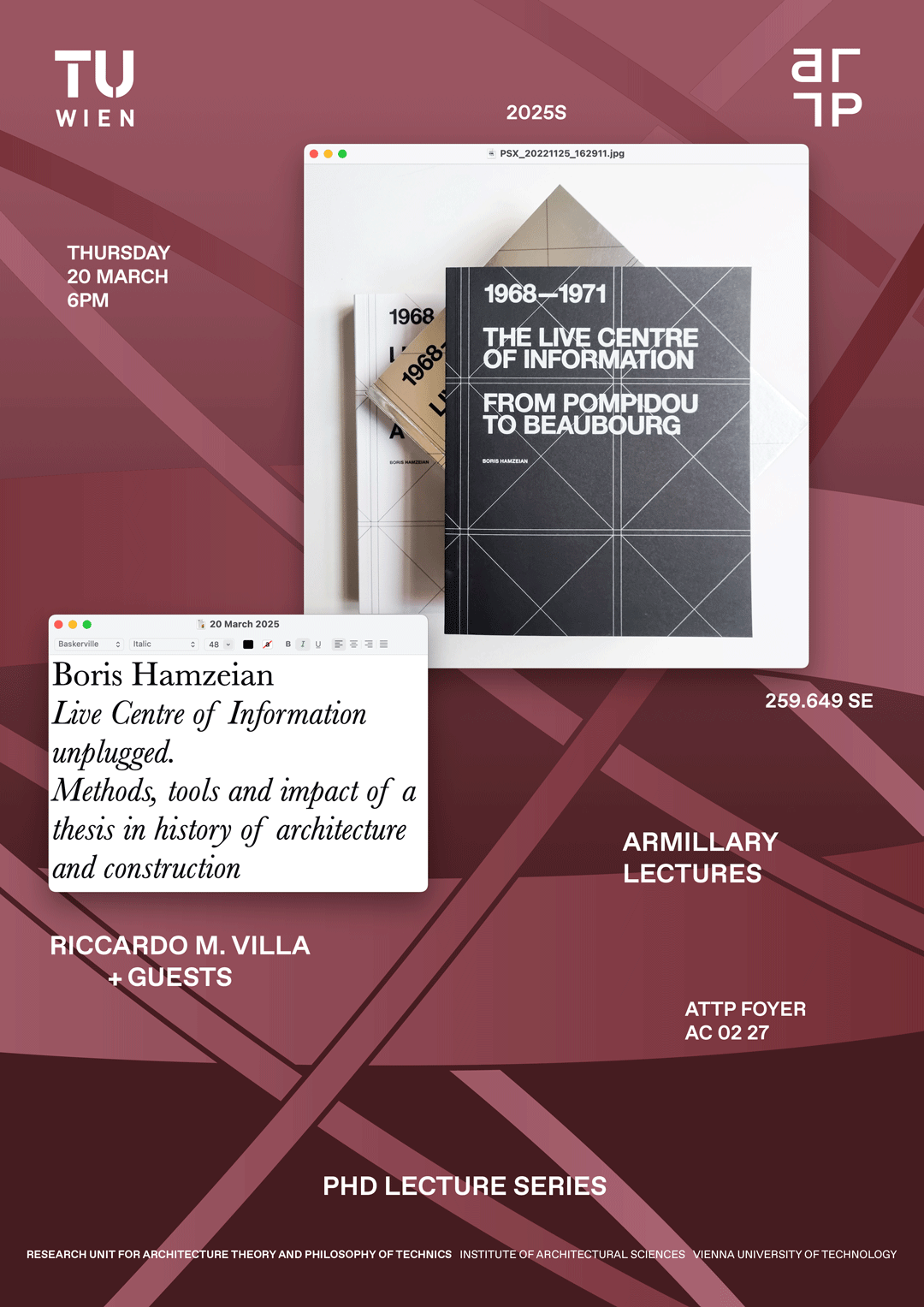 Armillary spheres are “models of the celestial globe constructed from rings and hoops representing the equator, the tropics, and other celestial circles, and able to revolve on its axis.” This lecture series wants to be a window onto the sphere of academic research, gazing at the different constellations drawn by doctoral dissertations within the horizon of architecture.