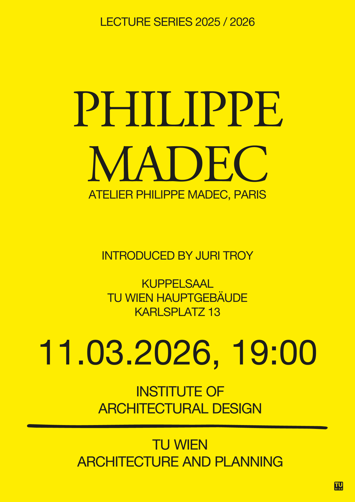 PHILIPPE MADEC Wed, 11.03.26, 19:00 Kuppelsaal, TU Wien Introduced by Juri Troy e/ Architect and urban planner, president associer (Paris, Rennes, Montpellier).
