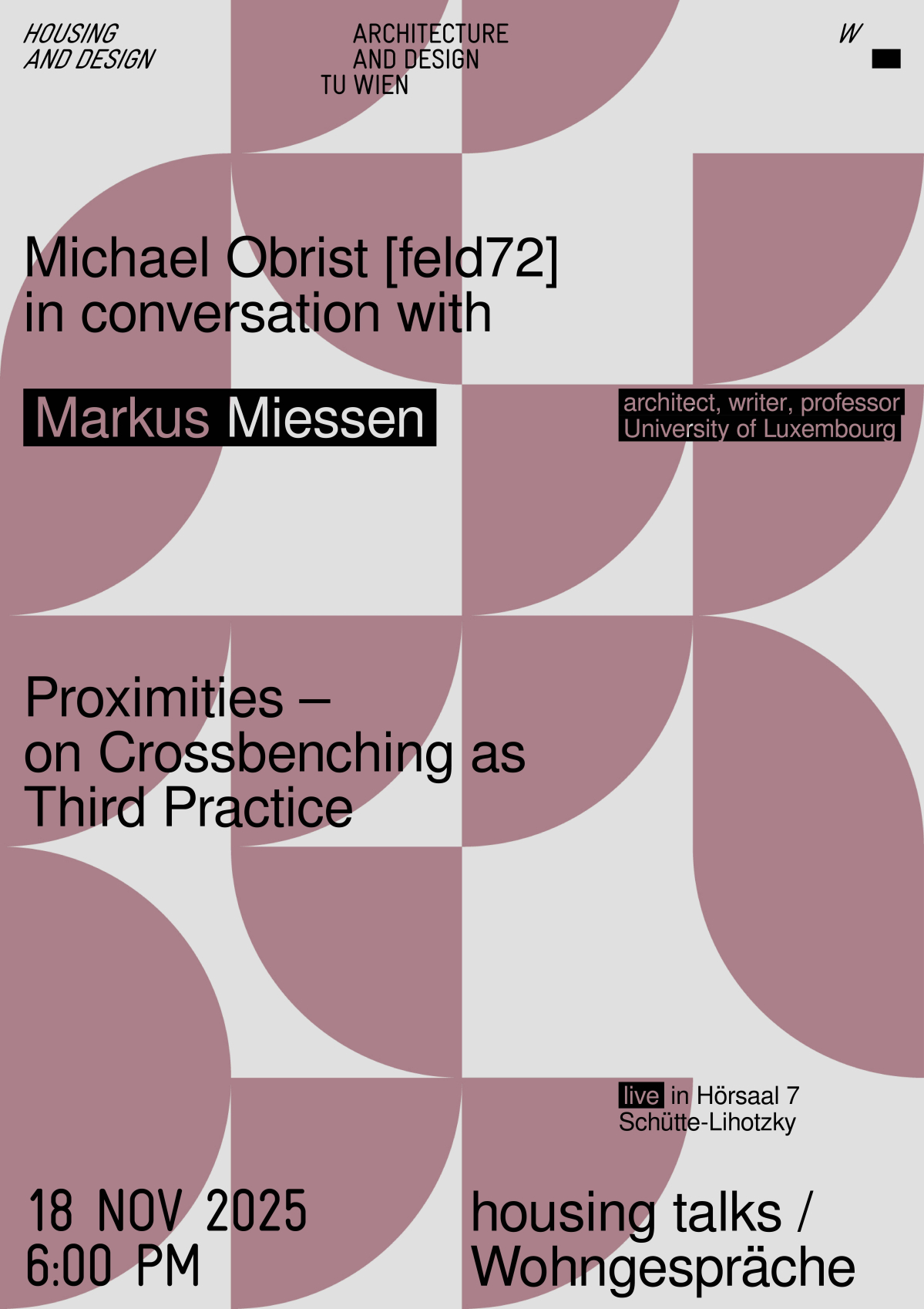 Michael Obrist [feld72] in conversation with Markus Miessen about "Proximities – on Crossbenching as Third Practice" Miessen’s talk will address his work on cultures of assembly, stressing the relevance of small-scale and decentralized spatial formats of local knowledge production to community building and embedded political decision-making in the context of the socio-ecological transition. It reinforces the role of both individual and collective action while proposing distributed assembly and proximity as core attributes in the production of the contemporary and future city. It calls for a revised form of spatial politics. Miessen’s ongoing research trajectory Cultures of Assembly investigates the sociopolitical dimension of (urban) spatial design. It articulates a curatorial impetus towards urban policy making in conjunction with spatial proximity as a tool to mediate between the individual, the collective, the neighbourhood, the city, state politics, and society at large. If we understand assembly as a form of spatial gathering, and the bonfire as the prehistoric space of assembly, what constitutes its contemporary equivalent? Markus Miessen Markus Miessen is an architect and writer, and in 2021 was appointed Professor of Urban Regeneration at the University of Luxembourg, where he holds the Chair of the City of Esch. Miessen has previously taught at the Architectural Association (London), the Berlage Institute (Rotterdam), has been a Harvard GSD Fellow (Cambridge), and has held professorships at Städelschule (Frankfurt), HEAD (Geneva), the University of Southern California (Los Angeles), and HDK-Valand (Gothenburg). He received his PhD from the Centre for Research Architecture at Goldsmiths, London, supervised by Eyal Weizman. His work revolves around questions of critical spatial practice, institution building, and spatial politics. As a spatial consultant, he currently works with the Munich Documentation Center for the History of National Socialism. He previously worked with the EU Commission, non-governmental organisations, the Republic of Slovenia during their presidency of the EU council, as well as many cultural and art institutions globally. Amongst many other books and writings, Miessen is the author of “The Nightmare of Participation” and “Crossbenching” (Sternberg Press). He has edited volumes such as “Para-Platforms: on the spatial politics of right-wing populism”, “The Archive as a Productive Space of Conflict”, “Agonistic Assemblies, on the spatial politics of horizontality”, and, with Nikolaus Hirsch, is the co-editor of the book series “Critical Spatial Practice”. Since 2024, he is also a Dean’s Visiting Professor at Columbia GSAPP, NY.