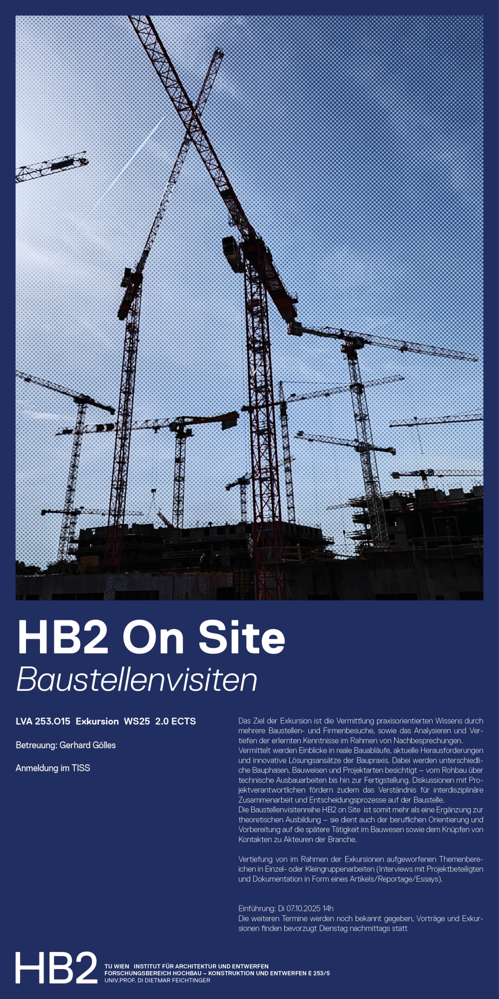 Vermittelt werden Einblicke in reale Bauabläufe, aktuelle Herausforderungen und innovative Lösungsansätze der Baupraxis. Dabei werden unterschiedliche Bauphasen, Bauweisen und Projektarten besichtigt - vom Rohbau über technische Ausbauarbeiten bis hin zur Fertigstellung. Diskussionen mit Pro-jektverantwortlichen fördern zudem das Verständnis für interdisziplinäre Zusammenarbeit und Entscheidungsprozesse auf der Baustelle.