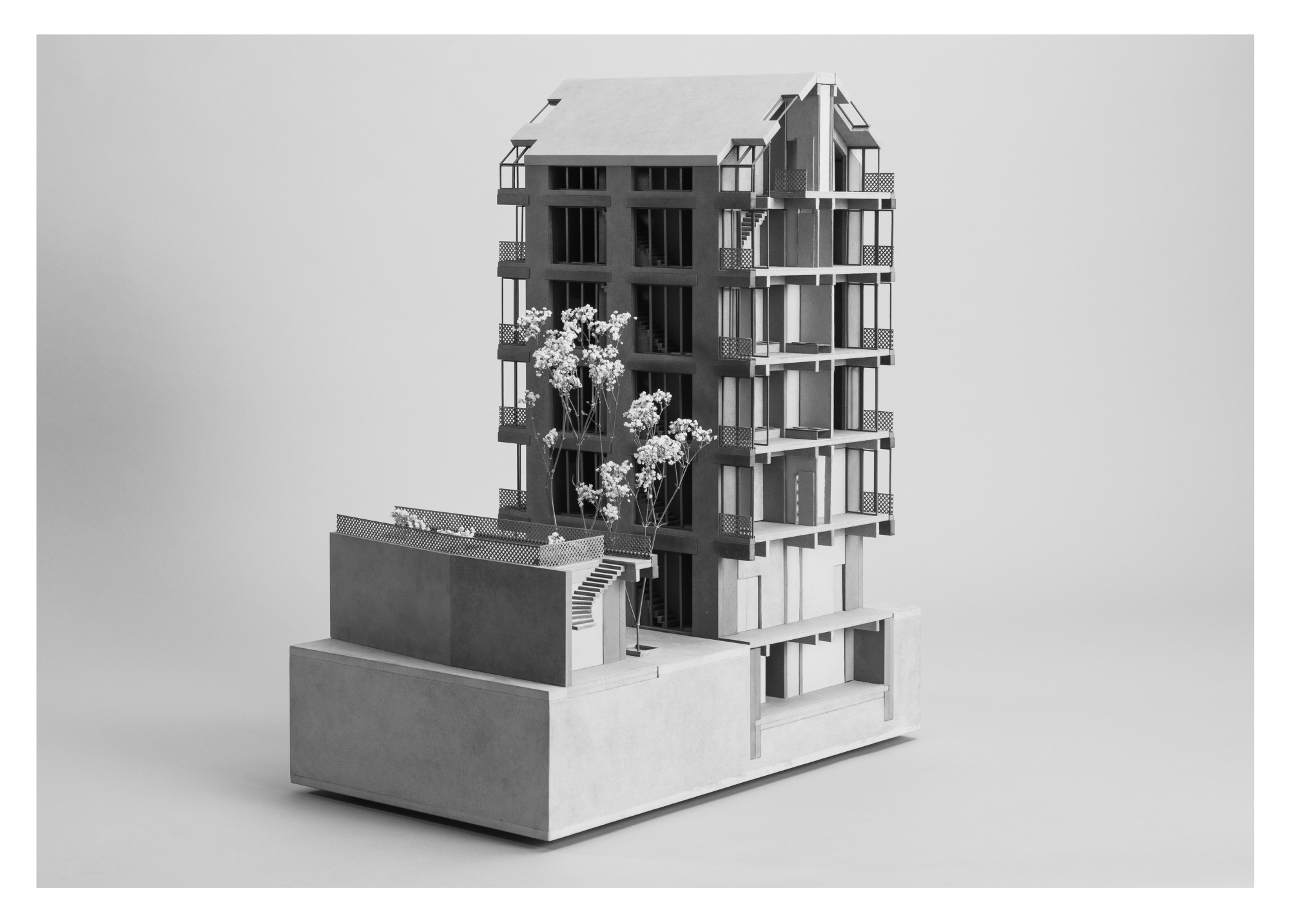 A prototypical design creates a replicable system. This is primarily a scalable concept for spatial and structural organization, which can be adapted to the context using variables and thus adapted for other properties. The system provides the framework for individual building design and is primarily designed to ensure maximum flexibility in use in relation to the structural effort required for changes. Therefore, the building should not be seen as a finished object, but as a process that is further developed by its users. With its focus on resilience and durability, the design is a proposal for sustainable building development in the future.